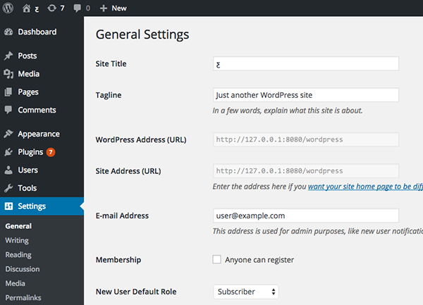 アドレスは「http://127.0.0.1:8080/wordpress/」に設定されています。