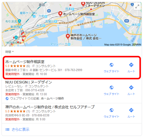 ナレッジパネルで表示される3サービスは、検索キーワードに関連性の高いサービスのうち上位3位までが表示され、残りは下の「さらに表示」というボタンをクリックすることで閲覧可能です。つまりGoogleマイビジネスに登録した情報が評価されることで競合が多く上位表示が難しい自然検索よりも上部に情報を表示させることが可能です。