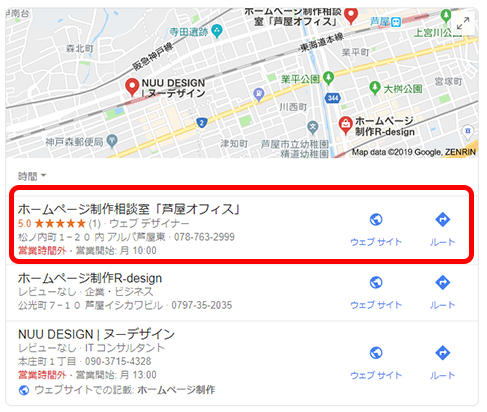 ビジネス申請後ページの作り込みを行うこと1週間程度で「ホームページ制作芦屋」で1位を実現しました。
