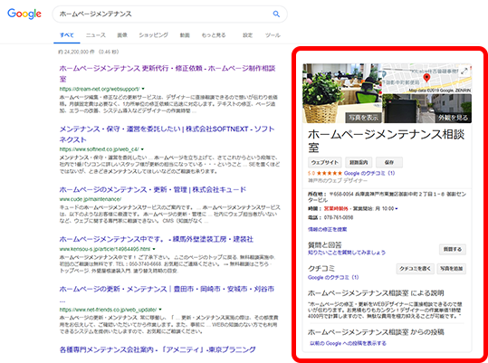 大きく表示されることでかなり目立つため、ホームページメンテナンスというキーワードに対してかなりピーアールができている状態となります。