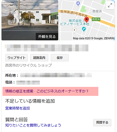 すると左のキャプチャー画像の通り、Googleがまとめた情報が表示されます。その中にキャプチャー画像ピンク箇所の通り「情報の修正を提案・このビジネスのオーナーですか?」と表示されます。