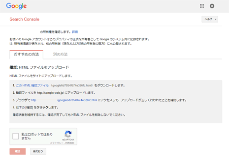 アップロード完了後、上記「Search Console登録画面」内の赤の「確認ボタン」をクリックすると登録完了です。