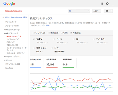 「Search Console」とはGoogleが提供するツールです。ここにホームページを登録すると、「ペナルティーの通知」「検索キーワード毎の検索結果への露出件数」「ホームページへのリンク数」「ホームページへのクロール数」「インデックス数」その他さまざまなホームページの状態をなどを確認することが可能です。