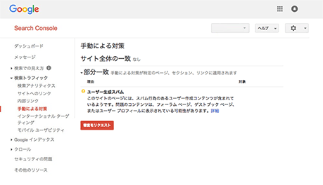 手動ペナルティーを受けた場合、Googleが提供する「Search Console」にて警告が表示されます。