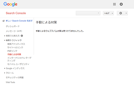 手動によるペナルティーを受けている場合は、サーチコンソールの「メッセージページ」と「手動による対策」ページにメッセージが表示されます。